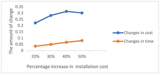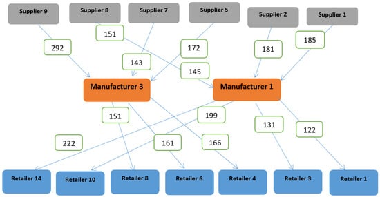 After solving the model by obtaining the values of the objective functions using the optimization software GAMS, the technology to be used by each of the suppliers, retailers, and customers was determined. The values of the primary and secondary objective functions were 13,995 and 21,406, respectively.
