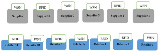 WSN is a network of sensors for monitoring and tracking the status of multiple devices. Sensors can be used for various purposes, including the monitoring of location, movements, temperature, pressure, flow, level, imaging, sound, air pollution, proximity, infrared, humidity, and speed []. They can also collaborate and communicate with RFID tags. Since RFID and WSN are regarded as complementary technologies, their integration is often considered as an option [].