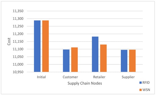 - The total cost includes the cost of establishing each node in the supply chain, blockchain implementation, RFID implementation, WSN implementation, and transportation among nodes.