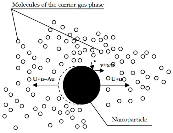 It is obvious that collisions of moving molecules of the gas phase with particles (Figure 1) lead to a change in the cross-sectional area of the collision according to Expression (8). The cross-sectional area is increased due to the increasing amplitude of local oscillations caused by Brownian motion [37].