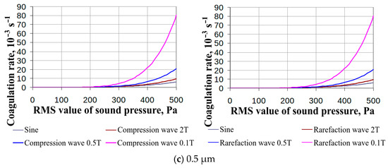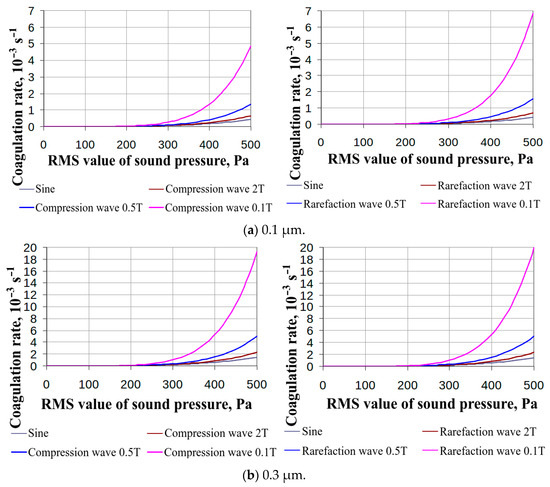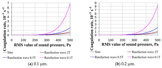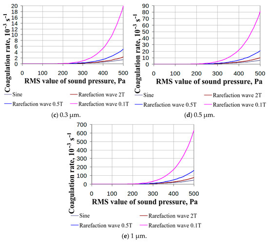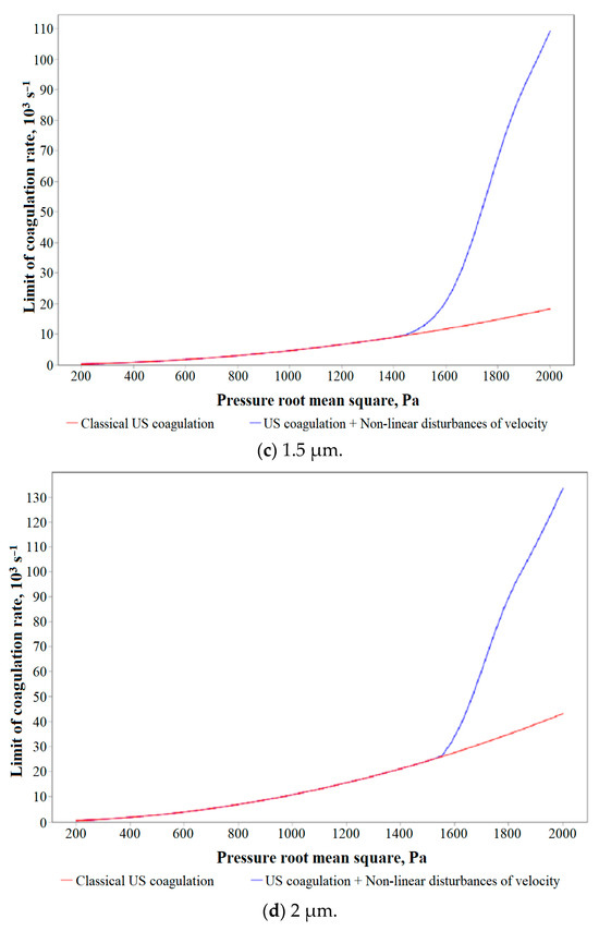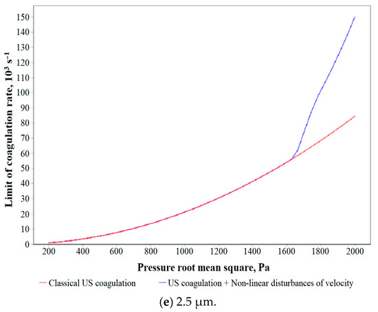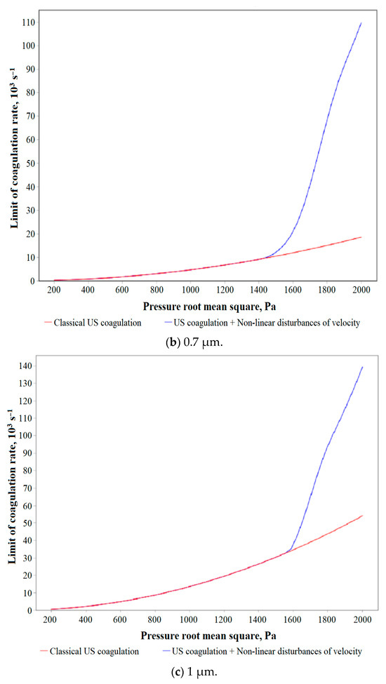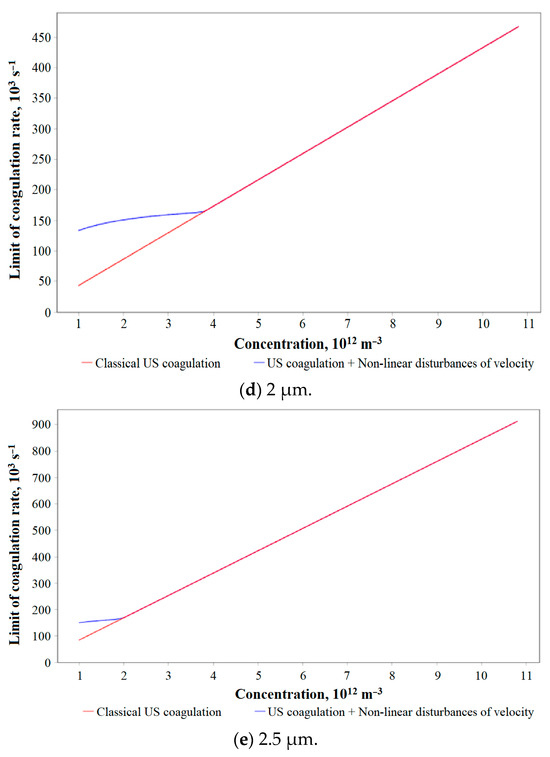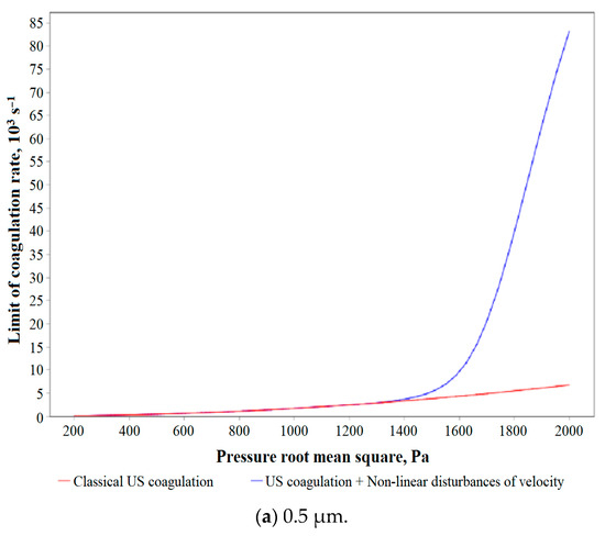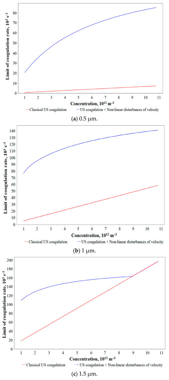 Therefore, further studies were carried out on the speed of ultrasonic coagulation at a reduced counting concentration of 1 × 1012 m−3 (Figure 6).