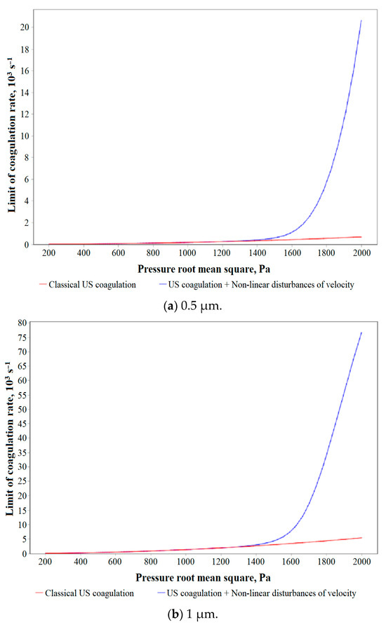 The obtained dependencies (Figure 5) made it possible to establish that, in the range of root-mean-square sound pressure values from 200 to 1400 Pa, nonlinear gas velocity disturbances have no effect, whereas they can increase the coagulation efficiency by more than 10 times for particles with a size of 0.5 microns and more than 2.5 times for particles with a size of 1 microns. The influence of nonlinear velocity disturbances is manifested for a similar counting concentration, only starting from a root-mean-square sound pressure of more than 1400 Pa. However, since nonlinear velocity disturbances determine the transfer of individual particles regardless of their concentration, and since the final speed of ultrasonic coagulation is directly proportional to the concentration because it is determined by pairwise collisions of particles, it follows that, at lower concentrations, the contribution of nonlinear velocity disturbances should increase. Meanwhile, at lower concentrations, the efficiency of ultrasonic coagulation, even in a nonlinearly disturbed pressure field, which directly affects the probability of collision of individual particles (see Section 3), will decrease proportionally.