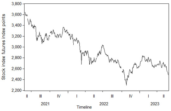 Our return analysis included daily data from 31 May 2021 to 31 May 2023: the opening price, closing price, highest price, lowest price, and trading volume of the main continuous contracts of SSE 50 stock index futures, as well as the closing price of the offshore RMB exchange rate (USD/RMB). Due to some inconsistencies between the opening dates of the SSE 50 stock index futures and the offshore RMB exchange rate, it was necessary to clean and sort the data of the two. The data source for this study was a certain financial terminal.