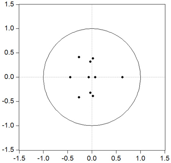 We constructed a VAR model to observe the dynamic relationship between the interactions and influences of these variables. Firstly, it was necessary to determine the lag order of the VAR model, and the optimal lag order could be determined by minimizing the AIC value and SC value of the information criterion at the same time. Then, a stationarity test of the established VAR model was carried out. It can be seen in the AR root diagram in Figure 3 that all points fell within the unit circle, which indicated that the established VAR model was stationary, so the impulse response and variance decomposition analysis could be carried out. Further insight into the dynamic relationships among the variables is provided in the following.