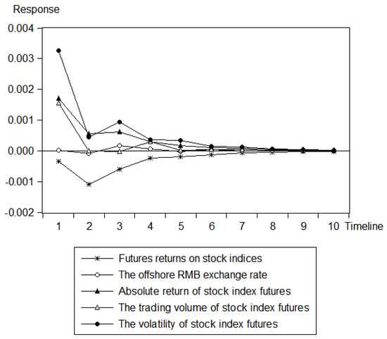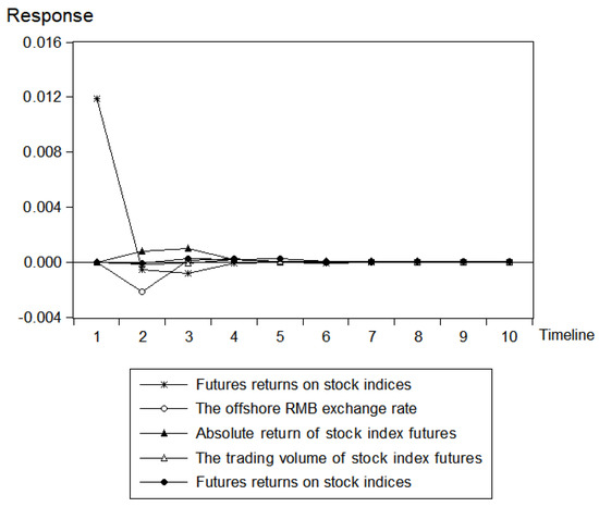 It can be seen in Table 3 that with the increase in its own lag period, the contribution of the price volatility of stock index futures to its own volatility gradually decreased and, finally, basically stabilized the residual disturbance of about 61.46%. The contribution of the trading volume to volatility gradually decreased with the increase in its own lag order and, finally, stabilizes at the residual disturbance of 25.00%. With the increase in its own lag period, the contribution of the offshore RMB exchange rate to the volatility slowly increased and, finally, stabilized at the residual disturbance of about 0.896%. These five variable explanations were basically stable in period 8.