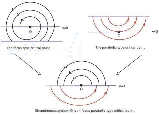 where and are real analytic functions. The system (1) is separated into two subsystems by one switching line given by the x-axis, in which the region (resp. ) is called the upper (resp. lower) subsystem of (1). It is easy to see from [5] that is a nondegenerate pseudo-focus and can be classified into four types, namely, focus-focus (FF), focus-parabolic (FP), parabolic-focus (PF), and parabolic-parabolic (PP). The FF-type critical point refers to the system (1) that has a pair of complex conjugate eigenvalues for their linear parts at , and their solutions rotate counterclockwise (or clockwise) around O. The FP (PF)-type critical point refers to the system (1) whose upper (lower) subsystem has a focus-type singularity at O, and the solution of the lower (upper) subsystem has a parabolic contact with at O such that the solution of that the contact point is partially contained in the upper (lower) subsystem. The local phase portrait of the FP-type critical point is shown in Figure 1. The PP-type critical point refers to the system (1) whose solution has a parabolic contact with at O such that the flow generated by the system (1) rotates around O. Recently, the problem of degenerate Hopf bifurcation of planar PWS system (1) with the FF-type critical point was widely studied; see, for example, [6,7,8,9,10] and the references therein. In [11], Zou and Küpper investigated generalized Hopf bifurcations and further considered the existence of periodic orbits bifurcating from a corner in a PWS planar dynamical system. The number of limit cycles for a class of planar PWS systems formed by the center and separated by two circles was investigated by Anacleto et al. in [12]. Furthermore, in [13], Zhang and Du studied the number of limit cycles of planar PWS systems bifurcated from the center and weak focus. In the last decade, people began to become interested in the study of pseudo-Hopf bifurcation, which creates a sliding segment and an additional hyperbolic limit cycle. In [14,15], Dieci et al. considered a PWS system involving a sliding segment and investigated limit cycle problems. In [16], Difonzo investigated codimensional two-limit cycle bifurcation using a new method and concluded that a codimension two-discontinuity manifold can be attractive through partial sliding or spiraling. They also proved that both attractivity regimes can be analyzed using the moment’s solution, a spiraling bifurcation parameter, and a novel attractivity parameter, which changes sign when attractivity switches from sliding to spiraling attractivity or vice versa. It is known that planar discontinuous piecewise linear differential systems separated by a straight line have no limit cycles when both linear differential systems are centers. In [17], Llibre and Teixeira investigated limit cycles of the planar discontinuous piecewise linear differential systems separated by a circle when both linear differential systems are centers and showed that the considered systems produce at most three limit cycles.