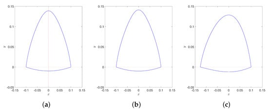 For small amplitude limit cycles, in addition to FF-type systems, many scholars have focused their attention on the cases of systems with FP (or PF) and PP-type critical points. It is worth noting that, as pointed out in [5], when the flow of the system (1) has a parabolic contact at a critical point and presents more difficulties, the first-return map may not be analytic. To deal with this problem, the generalized polar coordinates must be used. In [5], Coll et al. constructed an example of planar PWS quadratic systems with an FP-type critical point that bifurcates at least four limit cycles and with a PP-type critical point that bifurcates at least one limit cycle. Han and Zhang [10] investigated the Hopf bifurcation of non-smooth planar systems with FP- and PP-type critical points and obtained two limit cycles. Sun and Du proved in [30] that at least six limit cycles can bifurcate from a weak center and at least nine limit cycles can bifurcate from a weak focus in a planar PWS quadratic system with one switching line. This result improved to ten in [13]. In [18], Novaes and Silva investigated a PWS quadratic system with a PP-type critical point that has five limit cycles bifurcated from . Then, this result was improved to seven by Fan and Du [31]. In addition, the Hopf bifurcation and stability of PWS systems with a PP-type critical point were investigated in [32,33].