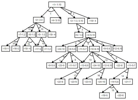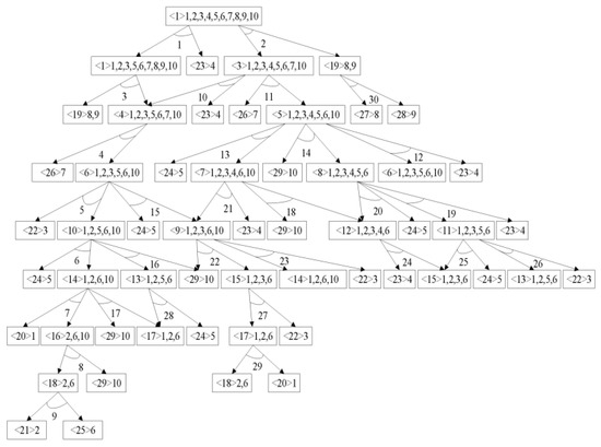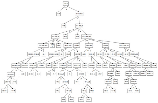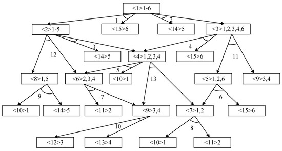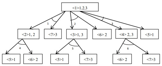 In order to better describe the problem and understand the disassembly sequence of each item, this paper uses AND-OR graphs to represent the relationship between all components or parts and the disassembly task [43]. In the AND-OR graphs, rectangle represents a component. Inside the rectangle, the numbers within angle brackets < > indicate the current component’s number, followed by a series of part numbers that constitute the component. Directed arrows from one component to another signify that the component can be disassembled through a specific task to require the next component. The number of angles formed by two one-way arrows represent the disassembly task. If a rectangle signifies a component that can be disassembled by multiple tasks, only one of the tasks can be selected for disassembly.