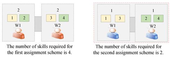 In these two schemes, the number of workers does not change, but the types of skilled workers do.In the second scheme, the multi-skilled workers are not needed. The calculation method of skill number is described in Figure 7. The task type of each workstation in the first scheme is 2, the required skill is 2, and the total skill number is 4. The task type of each workstation in the second scheme is 1, the required skill is 1, and the total skill number is 2. In the transformation process from Figure 5 to Figure 6, the second scheme has an obvious advantage in improving the efficiency of the enterprise. Furthermore, if the number of skills involved in task execution is increased, the probability of task quality degradation and risk enhancement is significantly reduced. Therefore, this paper studies PPDLBP based on the above-mentioned characteristics.