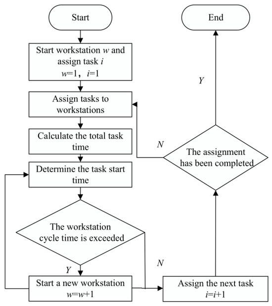 The decoding process involves assigning the disassembly sequence to the corresponding workstations. Figure 9 shows the complete decoding process. The principle of task assignment states that the total time for each workstation cannot exceed its cycle time. After assigning tasks, the objective function in the mathematical model is calculated based on the assignment of each workstation.