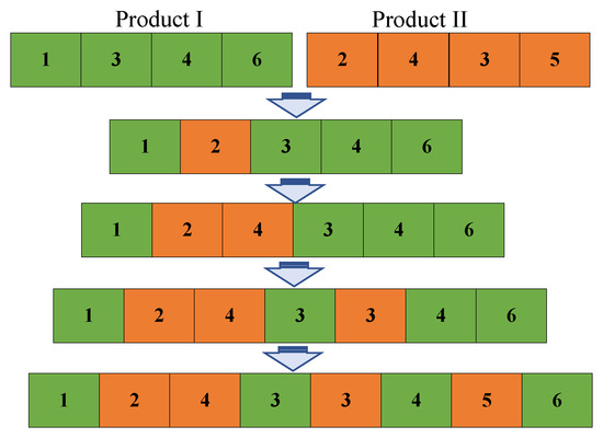 In this paper, each individual in the population corresponds to a feasible disassembly sequence. A certain number of individuals in the population form the population size. The population initialization process is similar to the encoding process. To ensure the randomness of the population, we adopt a random insertion method. Specifically, nodes from product II are inserted into the disassembly sequence of product I. When generating a feasible disassembly sequence for PPDLBP, it is essential to ensure the disassembly order relationship of each disassembly product on the parallel disassembly line. Taking the parallel disassembly line of two simple product components as an example, the generated disassembly sequence of each product using the random integer method may not necessarily be feasible. Therefore, we need to adjust the generated sequence to make it a feasible disassembly sequence. The process is illustrated in Figure 10.