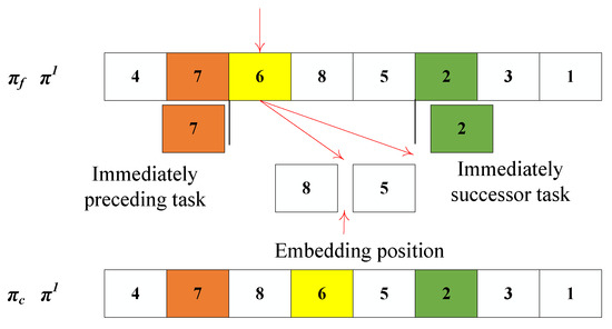 As a strategy based on local variation, IDBA can escape from the local optimal solution, thereby improving its performance. The strategy of the mutation operator is also based on the characteristics of neighborhood mutation. As shown in Figure 13, the process of the mutation operator includes randomly selecting a mutation point, then finding its compact pre-task and compact successor task. After that, the position of the mutation point can be dynamically adjusted to generate neighborhood solutions. For example, task 6 is selected as the random mutation point. According to the precedence relation matrix P, it is known that the immediate tasks of task 6 are tasks 7 and 2. Thus, there are two adjustment positions for task 6: one is behind task 8 and the other is behind task 5. Finally, it can be randomly inserted at one of them.