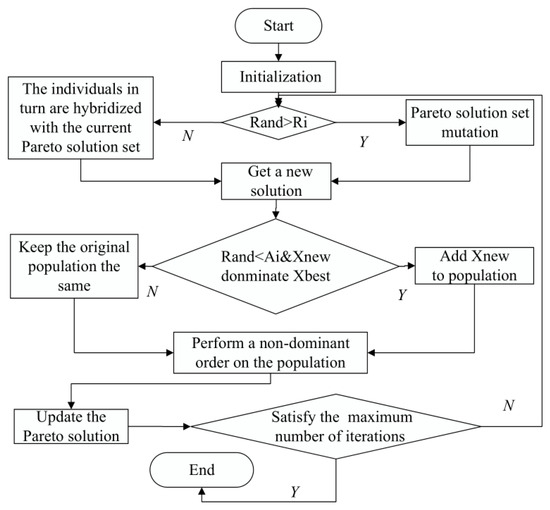 According to the methods of rank and crowding distance, we choose the first n individuals to combine the current population, and that combination becomes the next population. In the process of multi-objective optimization, individual fitness is determined by multiple objective functions, and individual fitness is determined by the dominance rule. Assume that there are U objectives, and if Equation (11) is satisfied, then solution is dominated by solution . The IDBA framework is shown in Figure 14. The algorithm is terminated when the predefined maximum number of iterations is reached.
