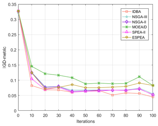 IGD-metric of each algorithm vs. the number of iterations.