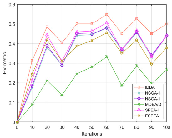 HV-metric of each algorithm vs. the number of iterations.