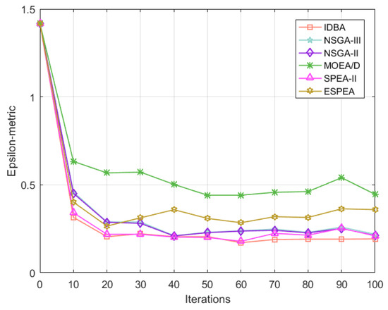 Figure 19 shows the changing trend of the HV-metric of IDBA and the comparison algorithms with the number of iterations. For the first 10 iterations, all algorithms show an obvious upward trend, among which IDBA has the fastest upward rate and the largest HV-metric. From the second 10 iterations, each algorithm still has an obvious upward trend, with a larger HV-metric than before. Due to the limitation of the number of iterations, the HV-metric becomes smaller after 30 iterations with no convergence trend, which reflects that each iteration of the algorithm will affect its performance. In terms of data, IDBA has the best HV-metric and the best fluctuation and convergence. Figure 20 shows the changing trend of Epsilon-metric of IDBA and the comparison algorithms with the number of iterations. It can be clearly seen that Epsilon-metric and IGD-metric have very similar trends.