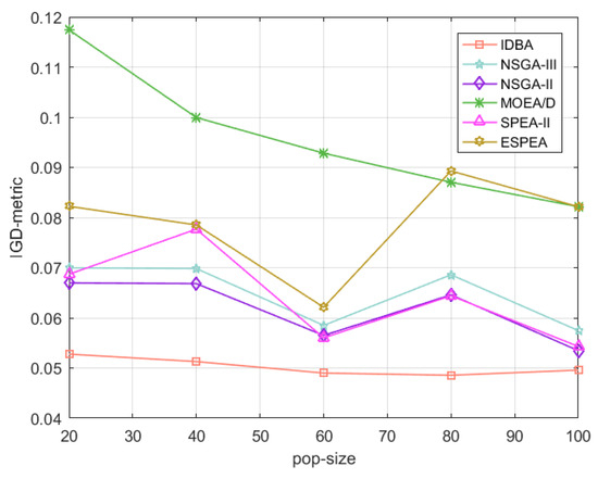 IGD-metric of each algorithm vs. population size.
