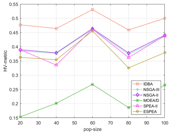 Figure 21 shows the changing trend of IGD-metric under different population sizes. It reveals that the population size has little effect on the algorithm, as well as the fluctuation degree of the algorithm. Notice that the curve of IDBA is always at the bottom of the figure, meaning its IGD metric is the lowest among the six algorithms, so the Pareto solution obtained by IDBA is closest to the real Pareto frontier. From this, we can draw a conclusion, i.e., under the premise that the population meets the maximum Pareto number, as long as the number of iterations of IDBA is sufficient, the algorithm can achieve good convergence in general. Similarly, the test method of IGD-metric is still valid for HV-metric and Epsilon-metric. Figure 22 and Figure 23 illustrate the changing trend of HV-metric and Epsilon-metric under different population sizes, respectively. It is easy to find that HV-metric and Epsilon-metric are consistent with IGD-metric.
