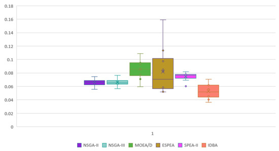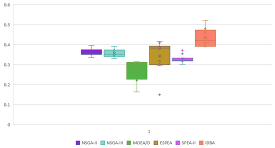 To evaluate IDBA, we use three box plots to record the values of IGD-metric, HV-metric, and Epsilon-metric. From a dataset neutrality perspective, the IDBA algorithm is weaker compared to the NSGA-II and SPEA-II algorithms. However, from Figure 24, we can observe that the IGD-metric value for IDBA is lower than the other algorithms, indicating that the algorithm’s solutions are closer to the true Pareto front and the distribution of solutions along the front is more uniform. As shown in Figure 25 and Figure 26, they represent the performance of IDBA and five other algorithms on the HV-metric and Epsilon-metric, respectively. From Figure 25, we can see that the value obtained by IDBA is relatively higher compared to other algorithms, indicating that IDBA performs better according to the HV-metric indicator. Similarly, from Figure 26, we can observe that IDBA’s value is lower than the other algorithms, suggesting that the algorithm’s solutions are closer to the true Pareto front. Therefore, based on the above analysis, IDBA demonstrates high efficiency in solving problems.