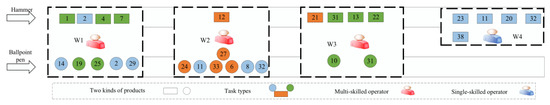 As can be seen from Figure 5, disassembly skill is required for disassembly tasks 1 and 3 of the ballpoint pen, and disassembly skill is required for disassembly task 5 of the ballpoint pen and disassembly tasks 2 and 11 of the radio. Moreover, disassembly tasks 1 and 2 are assigned to W1, disassembly tasks 3 and 5 are assigned to W2, and disassembly task 11 is assigned to W3. According to the required skills of each task, the types of workers can be obtained. It is easy to find that the number of workers is three, i.e., two workers with skills and and one worker with skill . Disassembly tasks 1 and 3 both require disassembly skill . If they are assigned to the same workstation, the first assignment scheme will cluster disassembly tasks of the same type, which will undoubtedly help workers to exert their enthusiasm and bring more benefits to the enterprise. As shown in Figure 6, the number of workers is three, but the types of workers are changed. The second assignment scheme requires two workers with skill and one worker with skill .