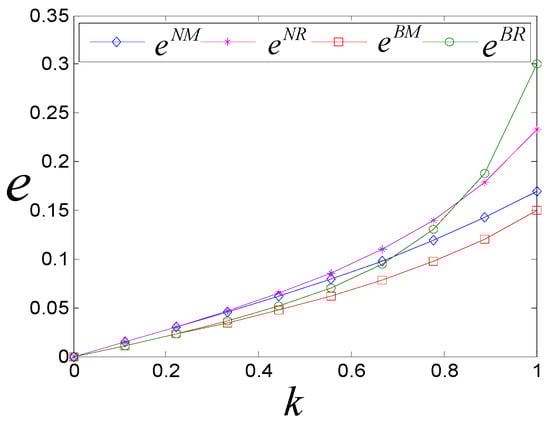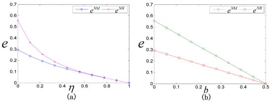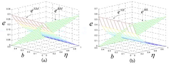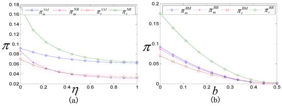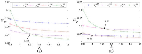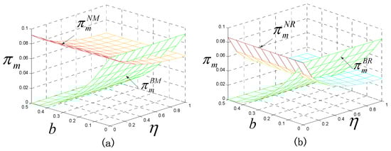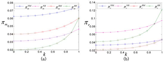 Corollary 6 illustrates that the retailer-dominated model contributes to energy savings and emissions reduction, regardless of whether the manufacturer implements blockchain or not. For the manufacturer, the extent to which its position affects the profit depends directly on the size of . When , is relatively low at this time, and the manufacturer can incentivize consumers to buy products by increasing carbon emission reduction; what’s more, the sales of low-carbon products are much higher in the retailer-dominated model. In a word, the retailer-dominated model can not only be conducive to the retailer’s own profit, but also to the manufacturer’s profit. When , consumers are skeptical about carbon emission reduction; furthermore, the high cost of increasing carbon emission reduction negatively affects the manufacturer’s profit. In view of that, the manufacturer may reduce product sales in the face of higher low-carbon research and development costs. For the retailer, on the one hand, the retailer-dominated model can improve enterprise profits; on the other hand, it also reduces the effect of consumer skepticism about carbon emission reduction in low-carbon products.