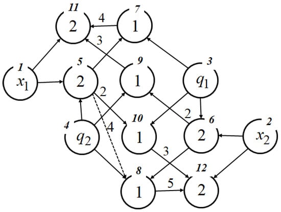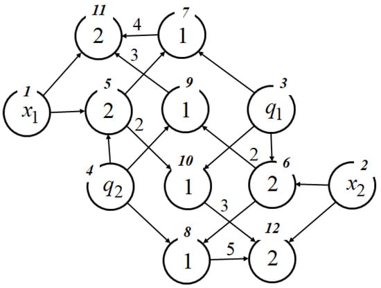 The nodes are enumerated in their upper parts. The arguments are in the source nodes №1–№4. Nodes other than the source node contain numbers of functions with two arguments. Numbers of functions with a single argument are displayed over the edges. Nodes №11 and №12 are the sink nodes. When the node indices are arranged such that the index of the node where the edge originates is lower than the indices of the nodes where the edge terminates, the network operator matrix becomes upper triangular.