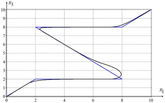 For a given model of the control object, it is necessary to develop a stabilisation system for movement along a given spatial trajectory. The given trajectory consists of straight segments in 3D space. To define a spatial trajectory of straight connected segments, it is enough to define the locations of connection points. In the considered example, the coordinates of the connection points are as follows