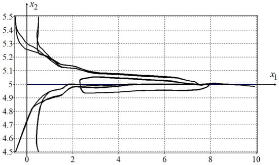 To check the feasibility property of the obtained solution of the optimal control problem, a simulation of the control system from eight different initial states was performed: , , , , , , , .