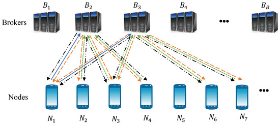 We consider a broker-assisted mobile network, where disjoint sets and , respectively, represent sets of correct and malicious mobile nodes (set of all nodes is denoted by ). Furthermore, set indicates the set of all brokers, which consists of sets and , representing the subsets of correct and malicious brokers, respectively. Other notations are provided in Table 2.