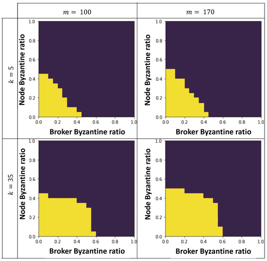 By defining random variable X as a number of Byzantine brokers picked by selecting ℓ brokers from all brokers, . Based on the Hoeffding inequality, we have , where .