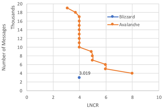 The total number of massages versus the lowest number of communication rounds (LNCR) in Blizzard compared with Avalanche for the following setting: , , and m is varied from 4 to 19.