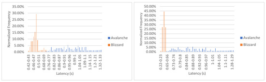 The left and right plots, respectively, represent the histogram of transaction latency of our proposed scheme (Blizzard) compared with Avalanche [15] for the case of 100 transactions, security parameters and . The left histogram corresponds to the settings of 100 nodes, 8 brokers, and 3 connections per node, while the right figure corresponds to the case of 200 nodes, 11 brokers, and 6 connections per node.