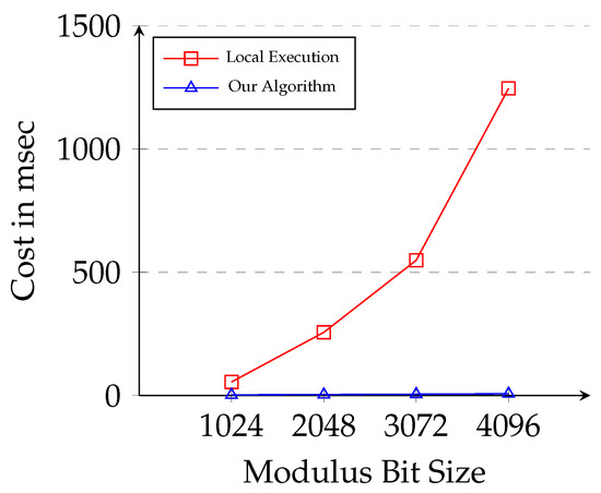 As the Hu et al. scheme is proven insecure and impossible to follow, we have not shown the comparison analysis with Hu et al.’s scheme. Additionally, Hu et al.’s protocol assumed the cloud server to be honest-but-curious and hence avoided the verification step. We have assumed the cloud to be untrustworthy and proposed a new verification scheme. Therefore, we have skipped the comparison of performance with Hu et al.s protocol. Instead, we provide evidence that our outsourcing scheme is more efficient in executing RSA communication in comparison to local execution.