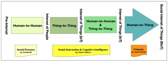 SIoT mirrors human behavior by strategizing selective direct or indirect friendships (such as Friend of a Friend—FoAF) to enhance the quality-of-service composition. The original concept of the socialism of objects was introduced by Holmquist et al. [5] in 2001. Figure 1 visually portrays the evolution of SIoT from the Pre-Internet era (human-to-human intelligence) [6]. Initially, social progress witnessed the integration of human-like traits into intelligent alien entities, progressing further by amalgamating collaborative human and object cognitive data [7].