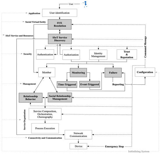 In striving for a more harmonious system within the realm of SIoTs, the reference model must align with a broad spectrum of requirements. In this section, we present our proposed architecture pattern designed to meet these imperative prerequisites. Building upon the discussion of key fundamental modules in SIoT from Section 4, we introduce the fundamental elements within the proposed SIoT architecture pattern, as visually depicted in Figure 3: