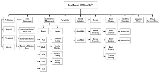 As highlighted in the preceding section, we delineated a comprehensive taxonomy detailing the foundational components within the construct of SIoT [33]. Illustrated in Figure 4, the pivotal elements of SIoT are systematically categorized into nine distinct realms: SIoT architecture, trust management, relationship management, navigability, friend selection, service discovery, fault tolerance, cloud–fog computing, and clustering techniques. Each category signifies the chronological progression of studies or their significance in relevant public events, as outlined in the subsequent subsections. This depiction offers a comprehensive overview of the evolution and relevance of each aspect within the SIoT landscape.