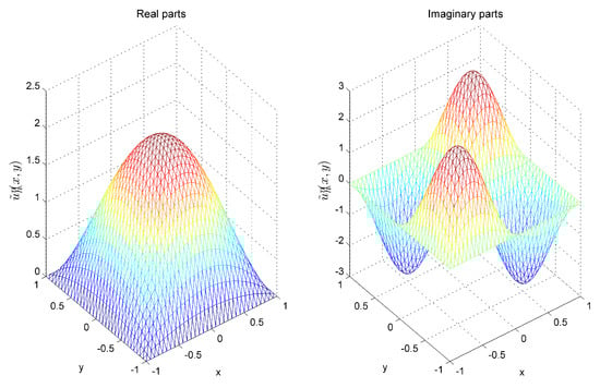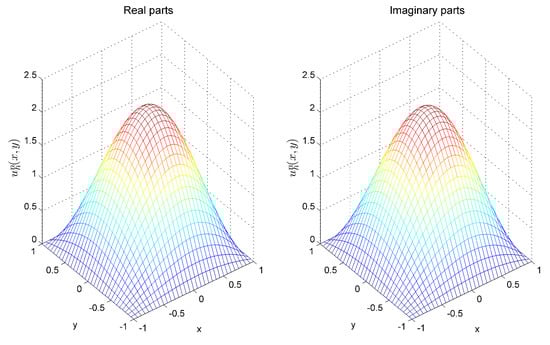 The domain is uniformly divided into families and of rectangular meshes with . The bilinear finite element solution is computed by the Crank–Nicolson fully discrete scheme, the two-grid solution is computed by Algorithm 2, and is the two-grid solution in [26]. The errors and CPU costs with respect to different times are listed in Table 5, Table 6, Table 7 and Table 8. It is obvious that errors in the two-grid solution are less than those in [26]. The profiles of three solutions at on a mesh are plotted in Figure 4, Figure 5 and Figure 6.