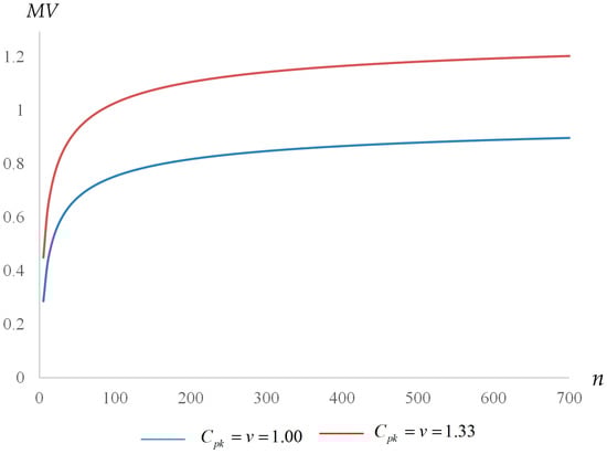 This study also took the upper confidence limit of process capability index as a statistic. Obviously, when , then , and the index estimate is used to make statistics, where the required minimum value (MV) is expressed as follows: