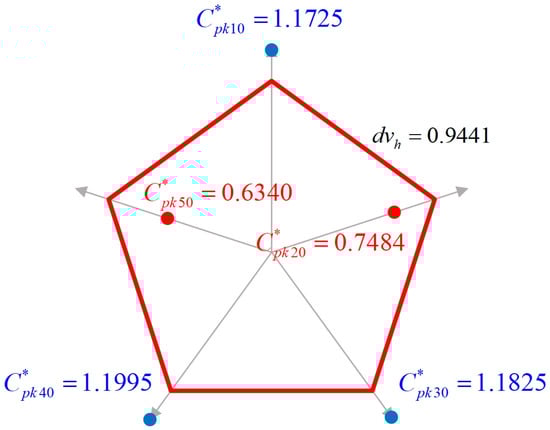 As mentioned above, the radar chart is a visual evaluation tool and is widely used in various fields. Therefore, this paper drew the fuzzy radar evaluation chart for the process capability based on the above two fuzzy testing rules. Not only can this chart simultaneously evaluate all of the quality characteristics of the product, but it also can help process engineers to judge the quality characteristics of components that need to be improved in a timely manner. Consequently, this paper used the radar chart to evaluate the process capability. For example, if a product contains five quality characteristics, there will be five radar lines on the fuzzy radar evaluation chart for the process capability; a regular pentagon with an included angle of 72 degrees will be formed; then, the endpoint value on each radar line with the distance from the center point will be connected to form a regular pentagon control block. Finally, the index observation value will be marked on each radar line, as shown in Figure 4.