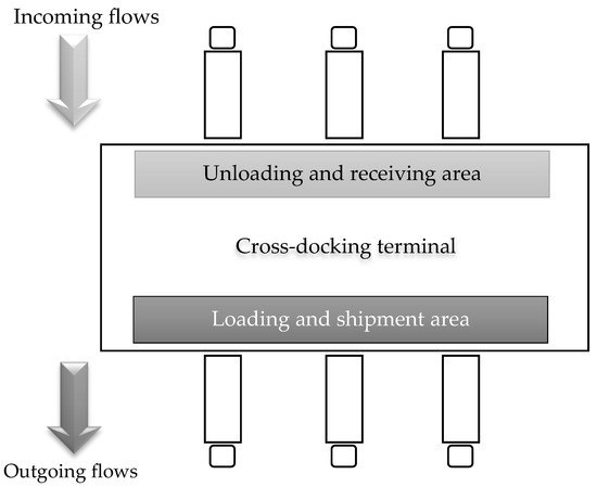 To address issues related to traditional warehousing, inventory ownership, and transportation costs, the cross-docking strategy comes into play. Cross-docking involves consolidating and shipping goods without storage or with limited temporary storage if necessary [3]. In a cross-dock terminal, incoming shipments are quickly unloaded, consolidated, and loaded onto outgoing transport vehicles on the same day. If temporary storage is required, it typically lasts no more than 24 h, according to several authors. Implementing the cross-dock strategy enhances transportation efficiency and cost-effectiveness without the overheads associated with traditional warehousing systems. Also, cross-docking reduces lead times and can impact improving customer order delivery time [4,5].