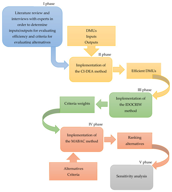 To tackle the described problem, a methodology based on the implementation of the CI-DEA–IDOCRIW–MABAC method was proposed in this paper. The proposed approach consists of several phases (Figure 2). In the first phase, a literature review and interviews with experts from the observed company were conducted to determine the inputs and outputs that would be taken into account in this paper. Based on the results of this phase, in the second step, the CI-DEA method was applied, firstly to reduce the number of observed inputs/outputs since only nine DMUs (distribution channels) were analyzed and, secondly, the implementation of the DEA method resulted in very poor discriminatory power (since all DMUs were efficient). In the next phase, only efficient DMUs were taken into account. During this phase, again, based on a literature review and interviews with experts from the observed company, criteria for the evaluation of alternatives were defined. The IDOCRIW method was applied in this phase to obtain the criteria weights. These values were then used in the final phase using the MABAC method to rank the alternatives (for potential cross-dock locations).