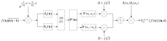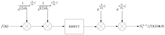 From Equation (53), the can be implemented by two complex 2D FTs; therefore, the final implementation of RBWLCT also mainly requires two complex 2D FTs. The algorithm and the calculation process for the RBWLCT are summarized in Algorithm 1 and Figure 3, respectively.