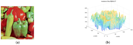 In the experiment, the parameters were set as follows: , and . In Figure 4a, the original color image is shown, which has dimensions of 512 × 512 pixels. The module of the RBWLCT spectrum is presented in Figure 4b. Additionally, we have plotted three imaginary parts of the RBWLCT spectrum in Figure 5.