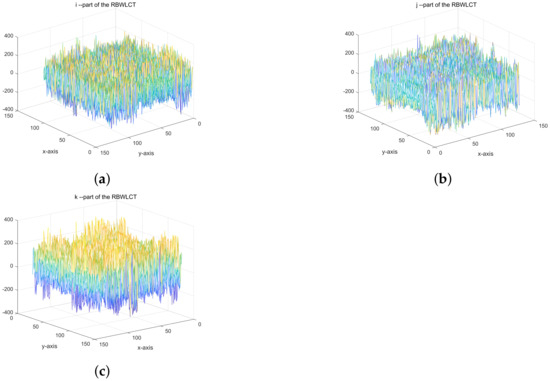 RBWLCT spectrum of the three imaginary parts of the color image. (a) ith imaginary part; (b) jth imaginary part; (c) kth imaginary part.