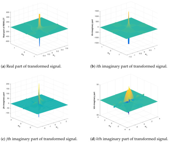 The graphical representation of the given biquaternion signal when is plotted in Figure 8, whereas its RBWLCT (14) of a signal with respect to the rectangular window and the real part of the transformed signal are depicted in Figure 9, for and From Figure 9, we see that the proposed transform reveals the local RBWLCT-frequency contents with a higher degree of freedom and enjoys high concentrations.