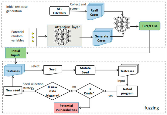 Currently, many vulnerability detection studies have also adopted deep learning technology [4,5,6]. The combination of deep learning and fuzzing provides new ideas for solving the bottleneck problem of traditional fuzzing technology. Deep learning technology can automatically learn grammar from a corpus set that conforms to input grammar rules and explore hidden correlations that are difficult to detect by manual methods during the learning process [7]. Learn & Fuzz [8] attempts to learn PDF syntax rules through the Seq2Seq model and iteratively predicts characters by moving the input sequence position step by step to intelligently guide seed generation. However, it only migrates the generated PDF objects to the original file objects, and the improvement in fuzzing performance is limited. Cheng et al. [9] proposed a machine learning-based framework that utilizes neural networks to discover the correlation between PDF files and the execution in the target program, in order to improve the seed input quality of fuzzing programs that use PDF files as input, but it mainly focuses on the generation of PDF files and does not provide a detailed explanation of the feasibility for other file types. Faster Fuzzing [10] uses generative adversarial networks (GAN) [11] instead of recurrent neural networks (RNN) to learn the distribution characteristics of data and directly generate new samples. However, due to the small size of the test cases used in the experiment, their effectiveness is limited. Smartseed [12] implemented seed generation using a Wasserstein GAN (WGAN) model. It faces problems due to the low quality of generated data samples and difficulty in convergence, and there is no clear explanation of the effectiveness of more complex GAN models. Ganfuzz [13] demonstrated the ability of GAN to generate highly structured inputs, learn the structure and distribution of data frames through GAN, and generate models that can resemble protocol message sequences. However, it only focuses on public or private industrial agreements.
