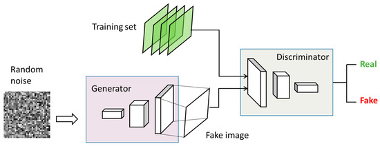 In GANs, the role of the generator is to generate as many realistic samples as possible, while the role of the discriminator is to determine whether the samples come from real data or fake data simulated by the generator. During the training process of the GAN, the generator is continuously trained to generate realistic samples, attempting to deceive the discriminator into recognizing the generated samples from real data, while the discriminator tries to improve its recognizing ability as much as possible to avoid being deceived by the generator. They play games and optimize each other until the generator can produce samples comparable to real data (Figure 3).