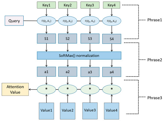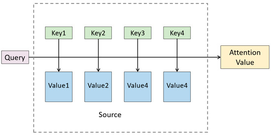 Attention mechanism is a technique in deep learning that mimics human vision and perception mechanisms. Its core principle is to effectively convert input data into vector form, assigning corresponding weights to each input position to represent the level of attention. The essence of the attention mechanism is to filter out a small amount of important information and focus on important information. The larger the weight, the more focused it is on its corresponding value, that is, the weight represents the importance of information, and the value is its corresponding information. The key calculation steps involve calculating the correlation between the model state and each input position, usually achieved by measuring the similarity between the input vector and the model state, such as dot product, scaled dot product, etc. In calculations, these weights are dynamically generated, allowing the model to flexibly adjust its attention to different location information in different contexts and input contexts. This dynamic adjustment mechanism enables the model to focus more on critical information in the input data, improving the model’s perception ability and information processing efficiency. As shown in Figure 4, the attention mechanism aggregates attention between the query and the key. Given a query, it calculates the correlation between the query and the key. Then, based on this correlation, it identifies the most suitable value. This process achieves attention weight allocation for the value, generating the final output result.