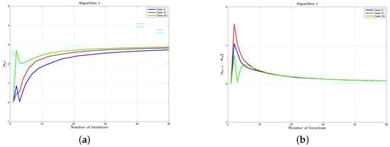 We choose and satisfying the conditions and . As a stopping condition, we set the maximum number of iterations at 50. The parameter is created at random in the range , where is computed by (3). It can easily seen that and we select the fixed point . Figure 1 depicts the behaviour of the sequences derived from Algorithms 1 and 2 using three distinct cases, which are mentioned below: