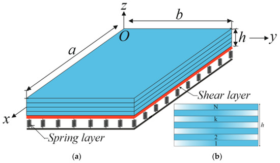 (a) Geometry and coordinate system of laminated exponentially graded plate on the two-parameter elastic foundation and (b) cross-section of laminated plate.